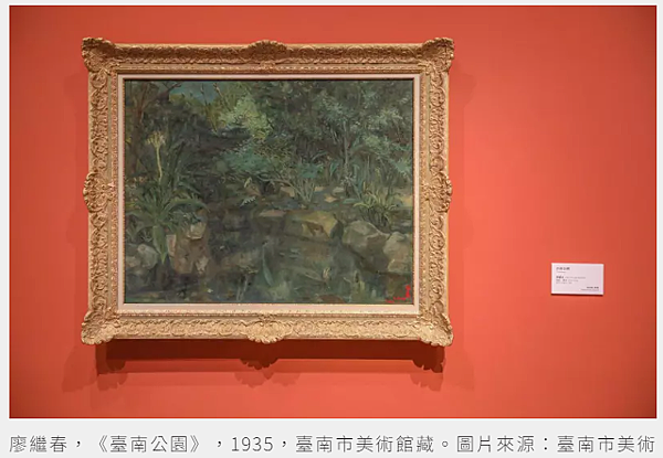 畫家筆下的空間之所以讓人有感,當然是因為畫家獨特的辨色之眼與敏銳的觀察力。2018年由收藏家蘇清祿以臺幣約3000萬元的價格購得,其後捐贈給臺南市美術館畫作──《臺南公園》,便是一幅廖繼春在1927年到1945年間,任教於臺南長榮中學、長榮女中、南一中各學校時的作品。臺南公園於大正6年(1917)開園,是臺南地最古老的公園,當時兼有熱帶實驗林的性質,因此樹種多元,加以園內有早前時代遺留的河流水道,林相優美,綠意盎然。