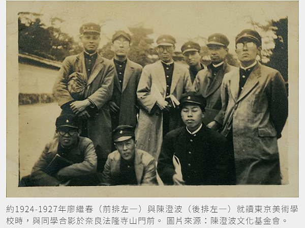 約1924-1927年廖繼春(前排左一)與陳澄波(後排左一)就讀東京美術學校時,與同學合影於奈良法隆寺山門前。 圖片來源:陳澄波文化基金會。