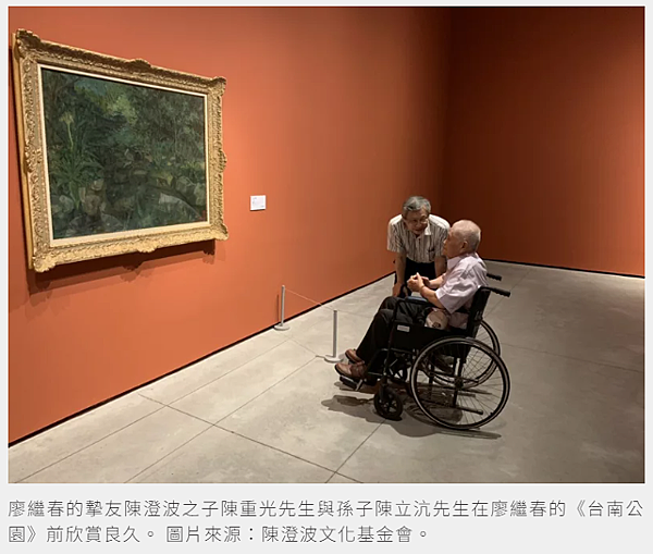 廖繼春的摯友陳澄波之子陳重光先生與孫子陳立沆先生在廖繼春的《台南公園》前欣賞良久。 圖片來源:陳澄波文化基金會。