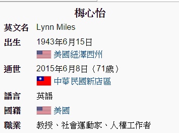 梅心怡(Lynn Miles)因罹癌,於八日晨子時撒手西歸,吾痛失摯友,臨風損涕,不勝唏噓。憶一九八九年起,吾透過鍾老(鍾肇政)向其同窗李登輝先生陳情,使梅氏得以於一九九二年重返台灣,距一九六六年渠被惡黨驅逐出境已廿五載,而一九九二年迄今又已廿三載,梅氏奉獻台灣人權越半世紀矣。