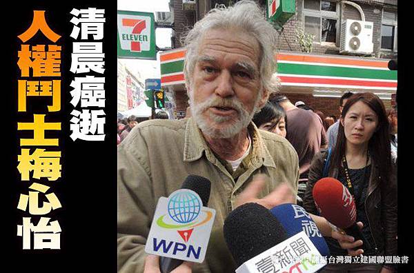 總是情義相挺的梅心怡,長年定居台灣,台灣心此生不渝。一九九六年中國以飛彈試射恐嚇總統大選中的台灣,他絕食抗議。去年太陽花攻進行政院,他參與並揭發行政院炮製自家網站業績的造假行徑。「一定要保護台灣人民,不要讓人民受傷害。」他對民進黨主席蔡英文有此臨終贈言。