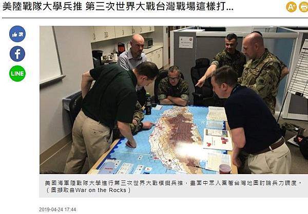 兵推顯示,雖然南韓被視為美國安全利益的關鍵,但南韓政府也需要負責自我防禦,美軍決定派出步兵師、2團海軍陸戰隊加入朝鮮半島戰場;至於台灣,美方派出海軍、空軍阻礙中國登陸兵團來到台灣,但台灣國軍需獨自在地面上與已登陸的解放軍作戰。兵推內容提到,中國空軍攻擊台灣駐紮在海灘的防禦部隊後,台灣軍隊被迫撤入山區,中國運來重兵力後,台灣軍隊回防台北,等待美軍增援,美國空軍、海軍持續攻擊中國集結中的部隊,日本也在擔心台灣落入中國的情況下,接受美國外交建議,派遣自衛隊加入台灣戰場。這個兵推結果是美軍贏得第三次世界大戰,但必須搶在對手動用核武之前贏得戰爭,且在戰爭的第一週,美軍與盟國軍隊,在波蘭、朝鮮半島、台灣的戰鬥中將損失15萬名士兵,相當於第一次世界大戰的消耗兵力-美陸戰隊大學兵推 第三次世界大戰台灣戰場這樣打... - 國際 - 自由時報電子報 http://bit.ly/2UyY8yp