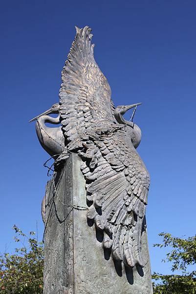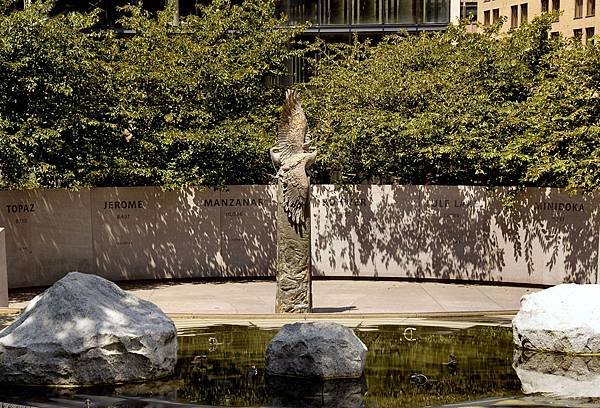 紀念碑中心是兩隻鶴,周邊環形牆上刻著十個集中營地點,以及參戰日裔軍人的名字,流水造景的石塊象徵日本四個島。紀念碑的存在,提醒世世代代的人們,不要再犯曾經做錯的事。