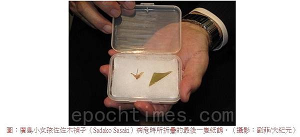 圖:廣島小女孩佐佐木禎子(Sadako Sasaki)病危時所折疊的最後一隻紙鶴。(攝影:劉菲/大紀元)