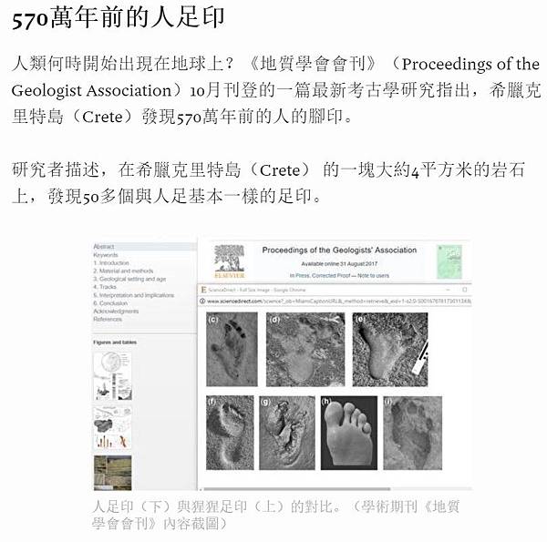 人類何時開始出現在地球上?《地質學會會刊》(Proceedings of the Geologist Association)10月刊登的一篇最新考古學研究指出,希臘克里特島(Crete)發現570萬年前的人的腳印。