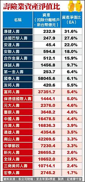 淨值比越高,代表來自股東口袋的自有資金越多,較有能力應付金融市場波動;若淨值比過低,等於是拿保戶的錢在進行槓桿操作,用小錢玩大錢