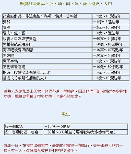 夙生吝於教導,以及肆口謗法,肆意譭謗有德之人者,沉淪重罪畢受後,還得多生蠢愚無知報。夙生為貪口腹,恣殺牲禽,以及曾為漁夫屠夫,獵戶庖丁,與曾操製造凶器火器毒藥等權,助成他人兇殺之業者,沉淪重罪畢受後,還得多生惡疾殘廢報。夙生貪慾無厭,止知剝人以肥己,慳吝鄙嗇,不肯周急而解囊者,沉淪重罪畢受後,還得多生貧窮困厄報。夙生知見狹劣,心存諂曲,巧言令色,掩飾行欺,逐境攀援,容量淺窄,因循怠惰,倚賴性成。煩惱垢重,怨憤易發,妒忌心深,情慾熾盛者,沉淪重罪畢受後,還得多生女身報。惟有佛法,善解諸縛。苦海無邊,回頭即岸。罪山萬仞,息念便空。是以虔作流布佛經,莊嚴佛像之無上功德者,過去積罪,自然逐漸剷除。未來勝福,穩教圓滿成就。