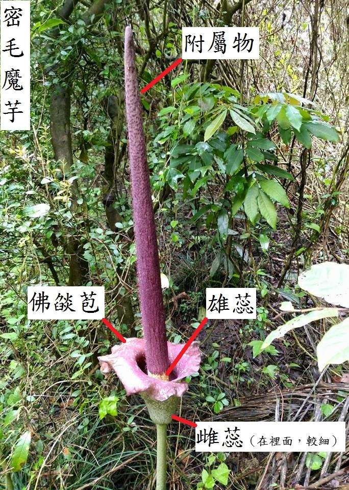 楊智凱說台灣有4種魔芋,分別為台灣魔芋、密毛魔芋、疣柄魔芋和東亞魔芋;它們都長有地下塊莖,在養分充足時會先竄佛燄苞花株,再從附近長出葉株。