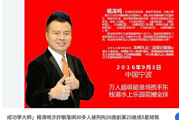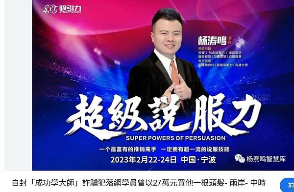 2023年2月,楊濤鳴舉辦的《超級說服力》課程遭舉報涉嫌精神傳銷,警方隨即收網,逮捕其本人及30餘名同夥。2025年6月,楊濤鳴因詐欺罪一審被浙江省寧波市中院判處無期徒刑、沒收個人全部財產。案件也警示社會:天上不會掉餡餅,掉下來的多是陷阱。唯有踏實工作、誠信經營,才是對自己與家人最負責的選擇。"又一大師被重判!他一根毛要賣25萬 7年吸金近16億 | 兩岸(大陸) | 三立新聞網 SETN.COM" https://www.setn.com/News.aspx?NewsID=1701307&utm_source=flipboard.com&utm_medium=flipboard&utm_campaign=flipboardnews