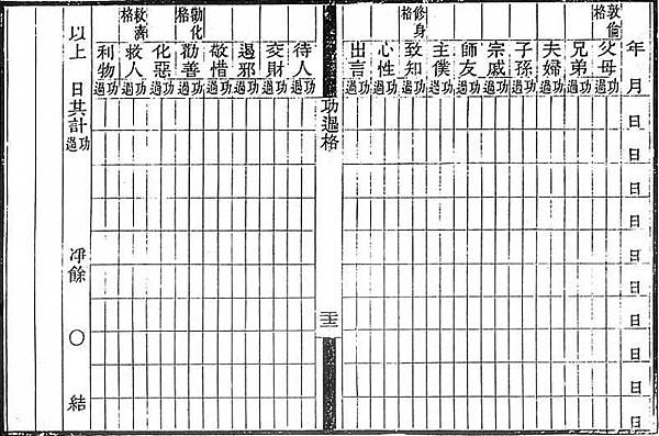 力行功過格者。須將此冊。存於案頭。另立一簿。以記功過。每舉一念。發一言。行一事。自揣是善是惡。即查冊內功過多少。逐日逐欵。挨登簿內。每月結算。將功折過。功過多餘。載入下月。毋矜功以自欺。毋掩過以自恕。初或過多功少。繼而功過相等。行之既久。則舉念皆善。雖此格亦無所用之。則功成而善根深矣。其福報豈可量哉。