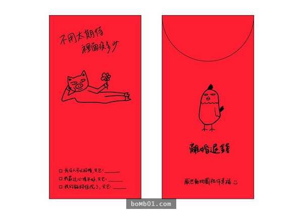 親朋好友結婚的時候,紅包上面該寫什麼好呢?無論是百年好合、還是白頭偕老,估計大家也都看膩了,沒有新意。知名插畫型網紅「厭世動物園」日前設計了一套超級中肯(實用)的紅包,只見上頭大剌剌的四個字:「離婚退錢!」讓人看了忍不住莞爾一笑。