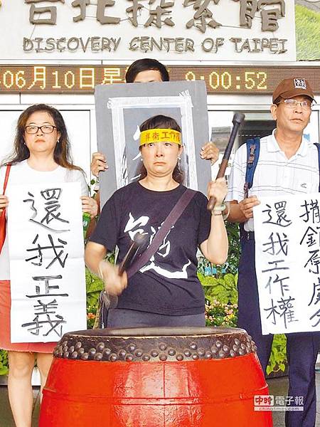 遭解聘教師蕭曉玲昨在市政大樓1樓廣場擊鼓申冤,力爭工作權,還呼籲廉政委員會將此案列為「第六案」,還給她公道。(張潼攝)