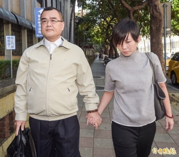 高等法院更二審23日開庭,行政院前秘書長林益世(右)在妻子彭愛佳陪同下出庭。(記者吳政峰攝)