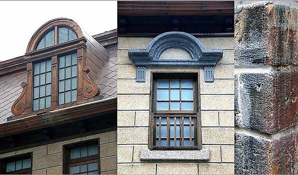 騎樓拱廊為四柱三間,拱圈是梯形唭哩岸石塊組合成,騎樓天花板有木材拼組成的圖案。一樓室內天花板原為印花鐵皮天花,但因多年前曾遭祝融現已找不到該種薄鐵皮材質,所以改用檜木,屋內角落目前以鋼構補強。洋樓屋頂屋面覆蓋銅片,屋頂仿蒙薩雙脊屋頂形式(因法國建築師蒙薩得名),屋面第一坡面較陡,第二坡面較緩接近平頂,第三坡度才是平頂。正面屋頂開有三個老虎窗,中間者最大,老虎窗具有通風功能。內部二樓屋頂複折式桁架造型美觀,但是為了忠於原有天花板覆蓋,因此完工後就看不到了,實在可惜。