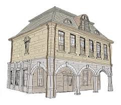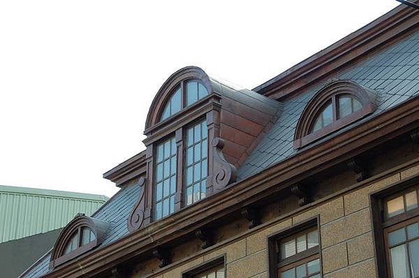 一樓為石造,外有精美的石拱騎樓。拱廊為四柱三間,拱圈是梯形唭哩岸石塊組合成,騎樓天花板有木材拼組成的圖案。一樓室內天花板原為印花鐵皮天花,但因多年前曾遭祝融現已找不到該種薄鐵皮材質,所以改用檜木,屋內角落目前以鋼構補強。二樓與屋架均為木造式,屋頂屋面覆以銅片瓦,屋頂仿蒙薩雙脊屋頂形式〈因法國建築師蒙薩得名〉,屋面第一坡面較陡,第二坡面較緩接近平頂,第三坡度才是平頂。正面屋頂開有三個老虎窗,中間者最大,老虎窗具有通風功能,內部二樓屋頂複折式桁架造型美觀。