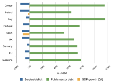 在經濟危機爆發前,希臘的國債就已經處於岌岌可危的階段(約為100%的GDP),隨後更一口氣飆升到GDP的170%。愛爾蘭進入經濟危機前的國債則低上許多,約為25%GDP,隨後暴增至95%左右的GDP。