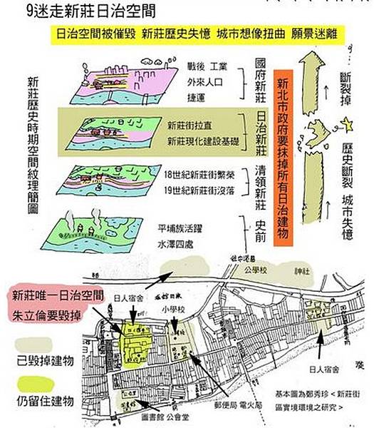 只是令人困惑不解的是,僅存於老街附近的日人宿舍及郡役所,新北市政府要全部毀掉:已認定古蹟的武德被新北市政府公辦都更規劃遷離;正被認定古蹟的新莊郡役所,被新北文化局違法影響郡役所古蹟認定(已被文化部糾正),意企圖毀掉。這些都是新北市政府毀日治空間的明證。