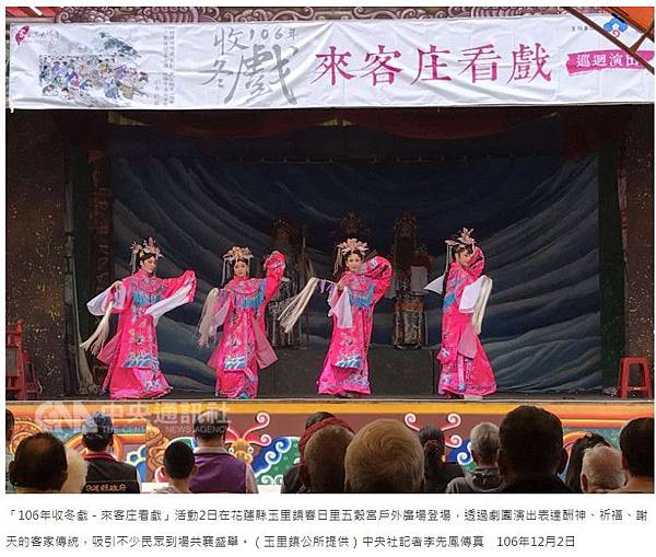 「106年收冬戲-來客庄看戲」活動2日在花蓮縣玉里鎮春日里五穀宮戶外廣場登場,透過劇團演出表達酬神、祈福、謝天的客家傳統,吸引不少民眾到場共襄盛舉。(玉里鎮公所提供)中央社記者李先鳳傳真 106年12月2日