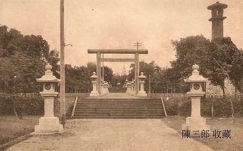 昭和時期嘉義高等女學校參拜嘉義神社景象-鞠躬的角度一致 這一定是有上禮儀課 並且不斷不斷的練習 全體達到幾乎一致的境界! 不知道日本現在的教育 還有沒有禮儀課這種東西??小學是道德課程(礼儀正しい)、中學是社會課程;私校則是另外制訂「礼法」課程。嘉義神社第一代本殿的水泥基座仍保留著,第二代本殿與第一代者轉了90度,二戰後改為忠烈祠,在改為射日塔前自燃。附屬的齋館(前往神社祭祀前齋戒和準備的地方)及社務所,連通後改為嘉義市史蹟資料館,值得參觀。