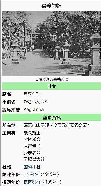 縣社嘉義神社(かぎじんじゃ)位在嘉義公園內,於大正4年(1915年)鎮座,昭和19年(1944年) 昇格為國幣小社,主祭祀天照大神、大國魂命、大己貴命、少彥名命及北白川宮 ...
