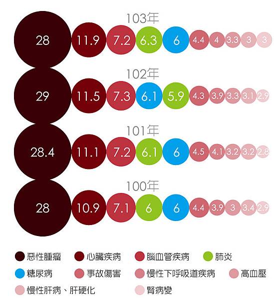 103年10大死因依序為惡性腫瘤、心臟疾病、腦血管疾病、肺炎、糖尿病、事故傷害、慢性下呼吸道疾病、高血壓性疾病、慢性肝病及肝硬化、腎炎、腎病症候群及腎病變,103年死因以慢性疾病為主,自殺繼99年連續5年退出10大。