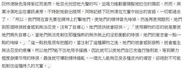 “使用藥物的目的就是要使她們喪失自尊心,當她們無法克制住那種強熱的無休無止的淫欲衝動的時候,她們的意志會一點一點的垮掉。”