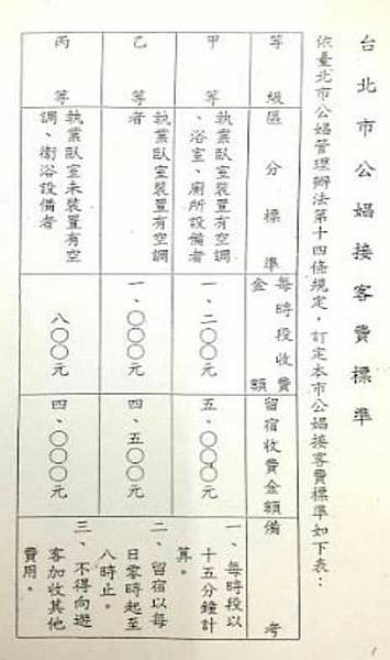過去,最「幼齒」的公娼有30多歲,年齡最大的將近60歲,「恩客」以藍領階層為主,交易公定價600元,每家妓女戶有4到5名小姐,淡季期間,有些公娼一天等不到一名客人,摃龜像是家常便飯。