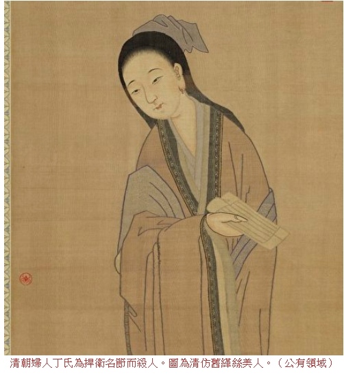 清朝婦人丁氏為捍衛名節而殺人。圖為清仿舊緙絲美人(公有領域)。