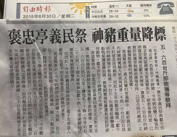 聯合報導,新埔褒忠亭(義民廟)是北台灣客家人信仰中心,創建於清乾隆55年(1790年),迄今225年,是縣定古蹟;其「褒忠亭義民節祭典」則自清道光15年(1835年)開辦,至今有180年歷史。