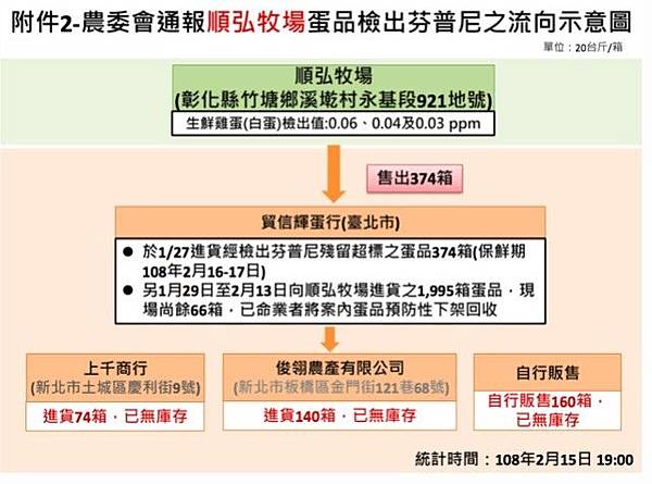 另,出貨新北市上千商行及俊翎農產有限公司,經新北市政府衛生局查核該2業者,該批蛋品皆販售予散戶、早餐業者,經查目前已無庫存。另為維護消費安全,貿信輝蛋行1月29日至2月13日向順弘牧場進貨之1995箱蛋品,現場尚餘66箱,已命業者將案內蛋品預防性下架回收。