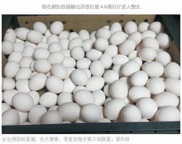 全台爆發缺蛋潮,各大賣場、零售店幾乎買不到雞蛋,蛋荒之際,又爆出芬普尼蛋。衛福部食藥署2天前接獲農委會通報,彰化縣的順弘牧場驗出芬普尼蛋,抽驗3件檢體,分別驗出芬普尼含量為0.03、0.04及0.06 ppm,而殘留標準為0.01 ppm,追查後,未發現現場有使用環境用藥,同時已要求預防性下架。