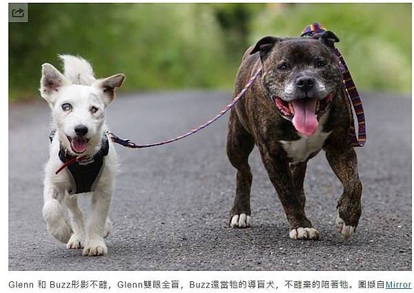 根據《鏡報》報導,國外兩隻狗Glenn和Buzz,被遺棄在海上隧道裡,被人一同發現,搜救員在救出兩隻狗時,發現Glenn的眼睛已經看不見了,認為想替牠找新家十分困難,沒想到牠的狗好友Buzz不離不棄的陪著牠,做牠的導盲犬。