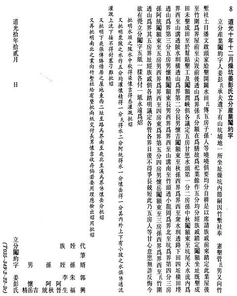 摘要 道光十年姜彭氏承夫遺下有山坑埔地一所,坐址燥坑內節,席請族戚前來踏定此業,除母親養老外,餘作五分均分。