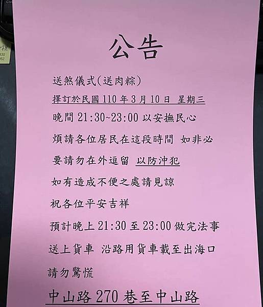 根據公告指出,桃園市中壢區中山路270巷至中山路附近,原定10日晚間9點30分起,進行送肉粽儀式,預計時長90分鐘,提醒居民切勿在外逗留,以防沖犯。