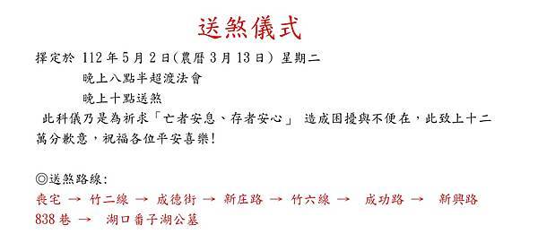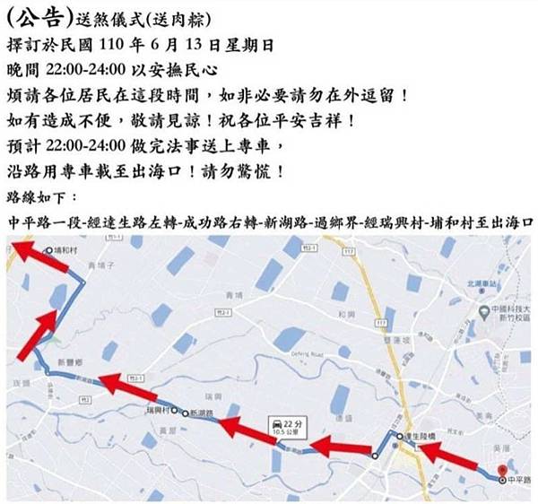 新竹縣湖口鄉明(13)日晚間將舉辦「送肉粽」儀式,更貼出路線表提醒附近居民非必要勿外出,讓當地網友感到十分驚訝,直呼「等著被檢舉!」而湖口鄉公所也對此作出回應。有送煞儀式以安撫民心,煩請各位居民這段時間若非必要請勿在外逗留,如造成不便敬請見諒,預計法事結束會送上專車,沿路載至出海口。儀式路線圖中可見,法事將從中平路一段經達生路左轉,成功路右轉至新湖路,過鄉界經瑞興村,行經埔和村再到出海口。質疑,「公祭都不行了還送肉粽」、「這樣算群聚嗎」、「現在疫情那麼嚴重,怎麼還在舉辦送肉粽」湖口鄉公所對此回應,已向承辦方確認,明日的儀式將由1名法師、2名家屬在室外進行,依照縣府宗教禮儀科認定屬於「家祭活動的延伸」,只要人數不超過10人,都在合法範圍 https://is.gd/GUcSrv