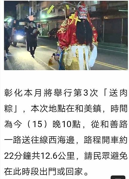 最近在彰化地區網友的臉書上,出現許多轉貼「送肉粽」的訊息,除了本月初彰化市已先舉辦過的「送肉粽」,另有和美鎮中寮里今晚十一時將從新中路左轉到福爾摩沙高速公路堤岸道路,最後到伸港鄉出海口,網友還呼籲大家注意「生人迴避」!