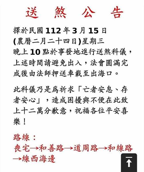 另外在二十八日晚間九時起於福興鄉大崙村展開,路線是從大崙街右轉番婆街直到彰鹿路六段十字路口,再左轉走南環路到底後右轉龍舟路直到彰濱出海口,當地的慈母宮也公告呼籲生人迴避!網友呼籲民眾有經過上述送煞路線的請自行迴避,慈母宮裏也有神尊加持過的淨符,有須要的信眾可至中殿神桌索取。