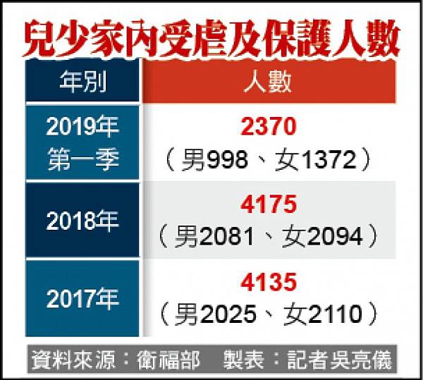 虐童案,各縣市二○一七年查獲四千一百三十五名兒童及少年被虐,去年四千一百七十五人,而今年光是第一季就高達兩千三百七十人。去年甚至有十五名兒童受虐喪命。受虐死亡兒童中,六歲以下的嬰幼兒就佔了八成-受虐致死的防治重點目前放在六歲以下 https://tinyurl.com/y2tpjse4