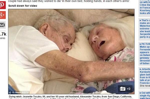 美國96歲的珍妮特(Jeanette Toczko)與95歲的亞力山大(Alexander Toczko)住在康乃狄克州(Connecticut)斯坦福(Stamford),已經結婚75年,在人生的最後,他們仍選擇躺在同一張床上,抱著彼此走完最後一段路。亞力山大當時說,「我們想死在彼此懷裡,牽著對方的手離去。」家人也完成了他們的心願。