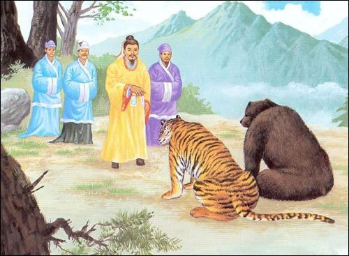 有一頭老虎和一頭熊原本同住在一個洞穴內,一日前來神壇樹下,祈求桓雄把牠們變成為人。(圖:網路)
