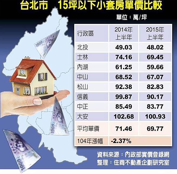 住商不動產整理北市上半年各類型中古屋產品與去年同期比較,15坪以下小套房今年每坪平均單價69.77萬元,比去年71.46萬元掉了2.37%。