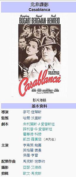 《卡薩布蘭卡》是由華納兄弟影片公司出品的愛情電影,由邁克爾·柯蒂斯執導,亨弗萊·鮑嘉、英格麗·褒曼、克勞德·雷恩斯、保羅·亨雷德等主演。