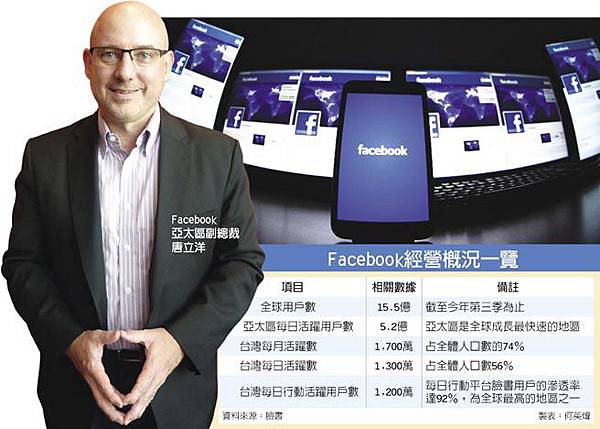 臉書(Facebook)亞太區副總裁唐立洋(Dan Neary)昨(23)日表示,台灣人在行動平台使用臉書的滲透率為全球最高區域之一。到第3季為止,台灣的臉書每日活躍用戶數為1,300萬,其中有1,200萬是透過手機連上,滲透率高達92%。
