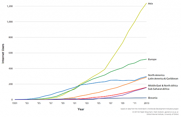 另外牛津網路研究所表示,這張有12.4億網路用戶的地圖數據,顯示出亞洲是全球網路用戶成長最快的地區,全球有46%的網路用戶在亞洲,而網路用戶比例在80%以上的國家大多集中在歐洲跟北美洲,「雖然網路已經成為很多人日常生活的一部分,但是世界上仍有許多人無法上網,目前只有略多於三分之一的人能使用網路。」。(劉人豪/綜合報導)