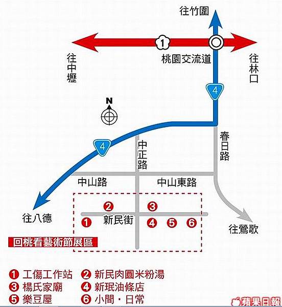 可從中山高桃園交流道下,接台4線續行春日路,轉中山東路接中山路轉中正路,至新民街口周邊找車位或停車場後,步行至新民街上各展點或店家。