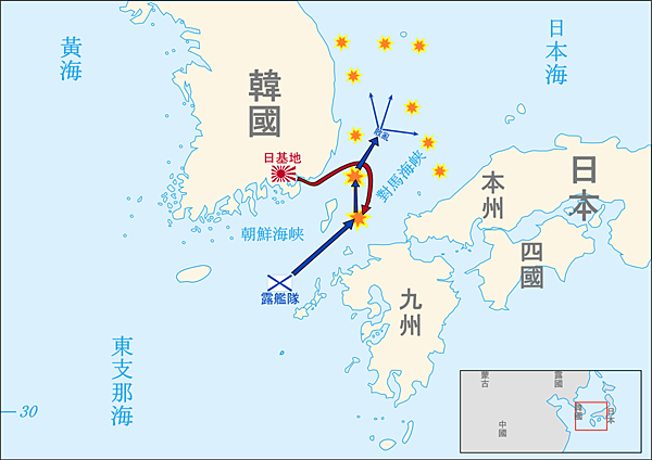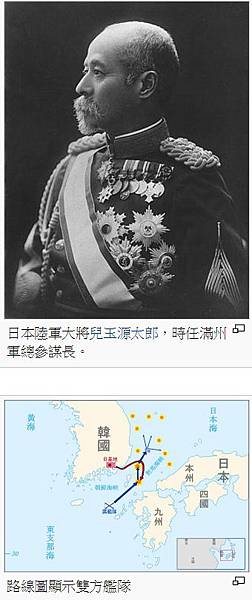 ‧當這支遠征艦隊離開金蘭灣時(5月9日),艦隊變得更加龐大了,已有88艘各式戰鬥艦艇和13艘輔助船艦。這樣一支龐大的艦隊駛往海參崴有幾條路可走,即「對馬海峽」、「津輕海峽」和「宗谷海峽」,其中對馬海峽的航線最近。從對馬海峽到海參崴只要三天的航行,艦隊司令決定硬闖對馬海峽!(如上圖)