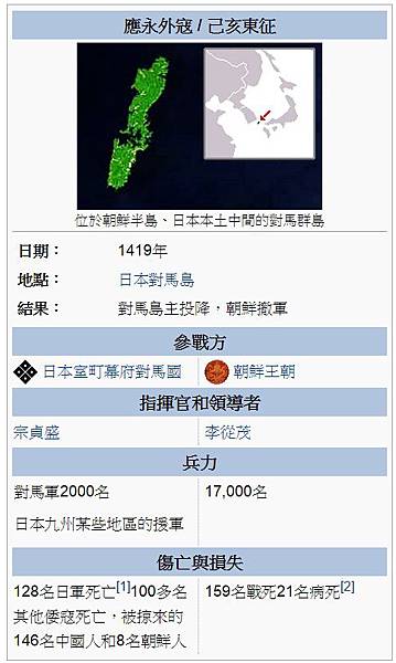1419年六月,朝鮮即將入侵日本的傳言使得日本國內人心惶惶,令人想起「元寇」。八月初七對馬宗氏向室町幕府報告擊退朝鮮軍隊。然而被俘的朝鮮士兵說中國即將入侵日本,使得幕府將軍足利義持十分緊張。