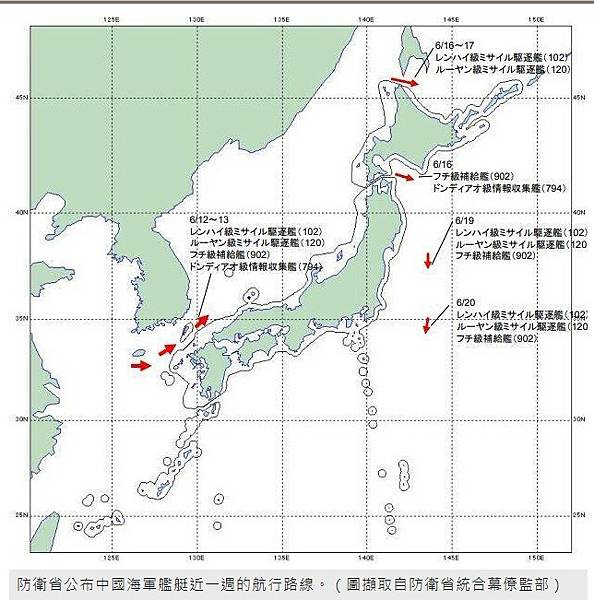 〔即時新聞/綜合報導〕中國與俄羅斯近期在西太平洋動作頻頻,日本防衛省統合幕僚監部19日公開俄羅斯艦艇編隊繞行日本的航跡圖,20日則是公開中國艦艇進日以來的航跡,中國艦艇從對馬海峽北上至北海道,進入太平洋後再南下航行,與俄艦同樣是「繞行日本」。