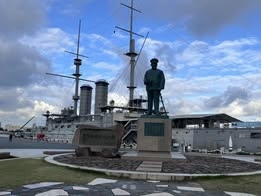 (三笠紀念公園中的「三笠紀念艦」和當時艦隊司令官東鄉平八郎的銅像。)