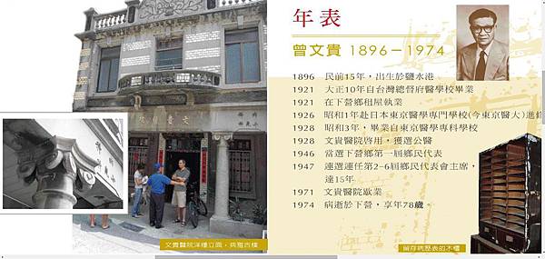 現年76歲的下營鄉民曾丁芳憑著年幼時就診的記憶,向工作室人員說明當年由「文貴仙」看診情形。曾丁芳說,當時地方民眾有大小疾病,都到文貴醫院 求診,因醫院內人手不足,曾文貴除了看診,還要負責包藥,送走1名病人,再繼續面對下1名病人;由於曾文貴同時身兼公家醫師,在醫院對面還有一處診間,專門診治煙花女子。